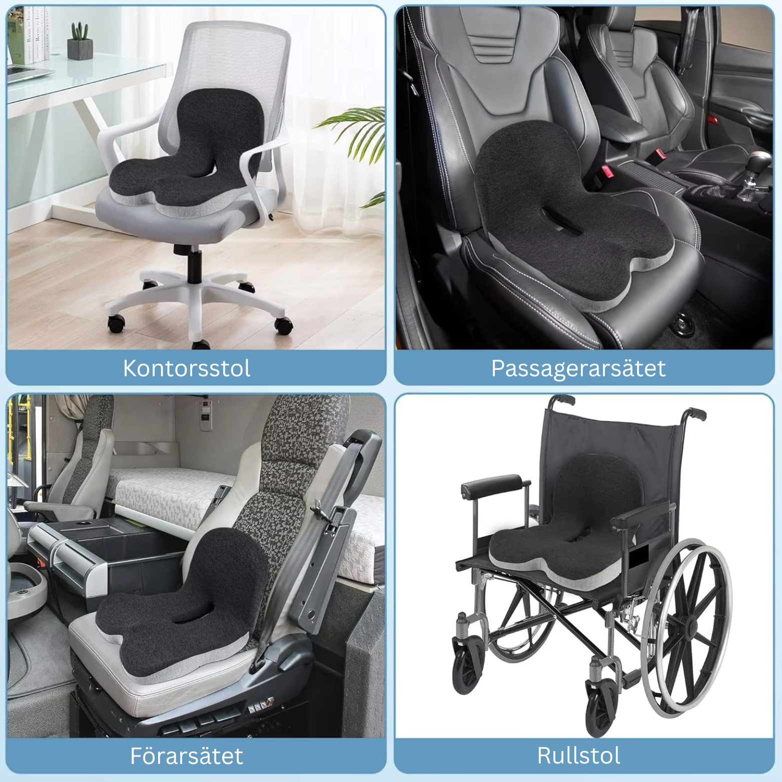 Långt sittande kan tippa bäckenet och pressa ihop ryggraden, vilket triggar smärta i nedre rygg och svanskota. Nova™ är formad för att varsamt lyfta höfterna, lätta på nervtryck och styra kroppen in i en bättre position – så att du orkar sitta längre, bekvämare.